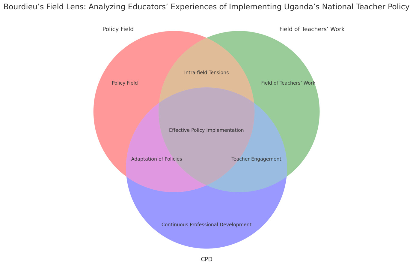Bourdieu’s concept of field provides a framework for analyzing the distinct but interconnected social spaces where agents operate with varying degrees of power, resources, and influence. In the context of Uganda’s National Teacher Policy (NTP), two primary fields are of interest: the policy field and the field of teachers’ work. Each field has its own structure, agents, and stakes, and their interaction shapes the implementation of the NTP.